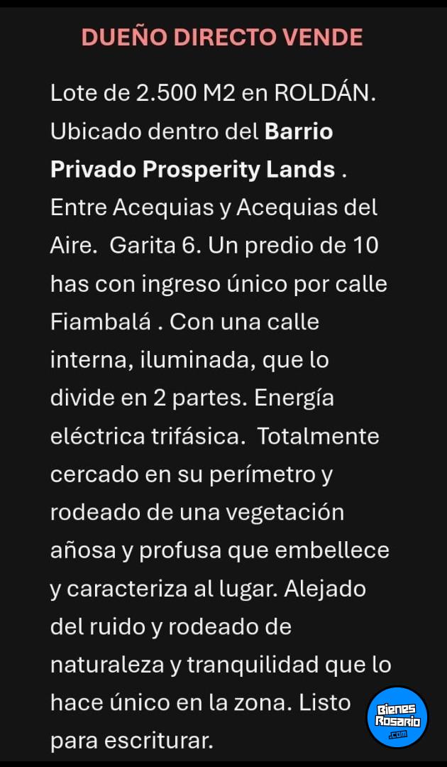 Excelente lote en barrio privado de Roldán. Dueño directo vende.