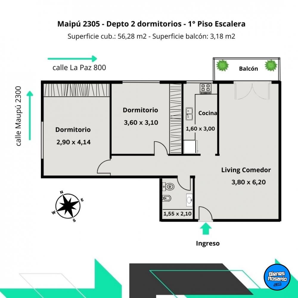 Este departamento incluye living comedor con salida a balcón que da a calle La Paz, cocina independiente y funcional con conexión para lavarropas, dos dormitorios de generosas domensiones con placares de piso a techo y un baño completo. La cercanía a facultades y avenidas comerciales, así como la oferta gastronómica de la zona, como las famosas calles Pellegrini y 27 de Febrero, enriquecen la experiencia de vivir en este sector vibrante de la ciudad.