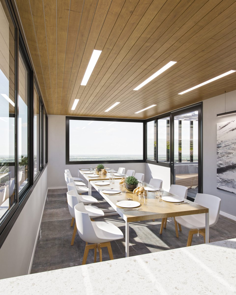 El edificio cuenta con quincho, pileta en altura con vista a la costa, cocheras opcionales, gimnasio, parrillero, solarium y laundry.