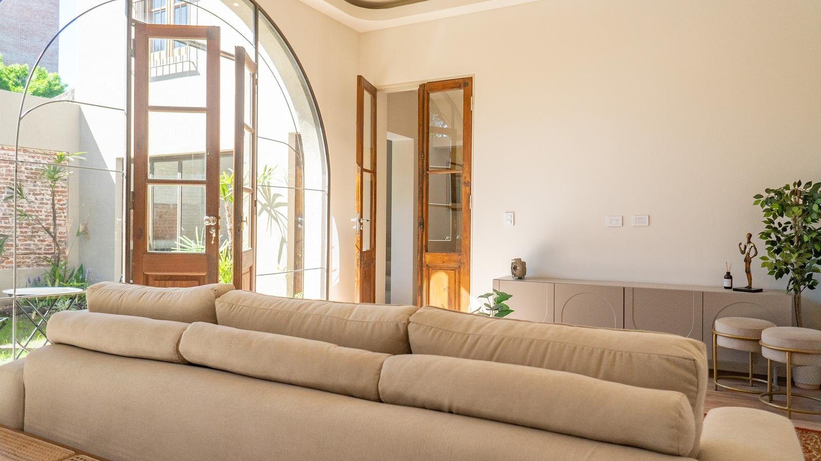 SE INGRESA POR UN AMPLIO LIVING - SALA DE ESTAR CON VENTANALES MODERNOS QUE DAN A UN PATIO CON PILETA Y ESPACIOS VERDES
