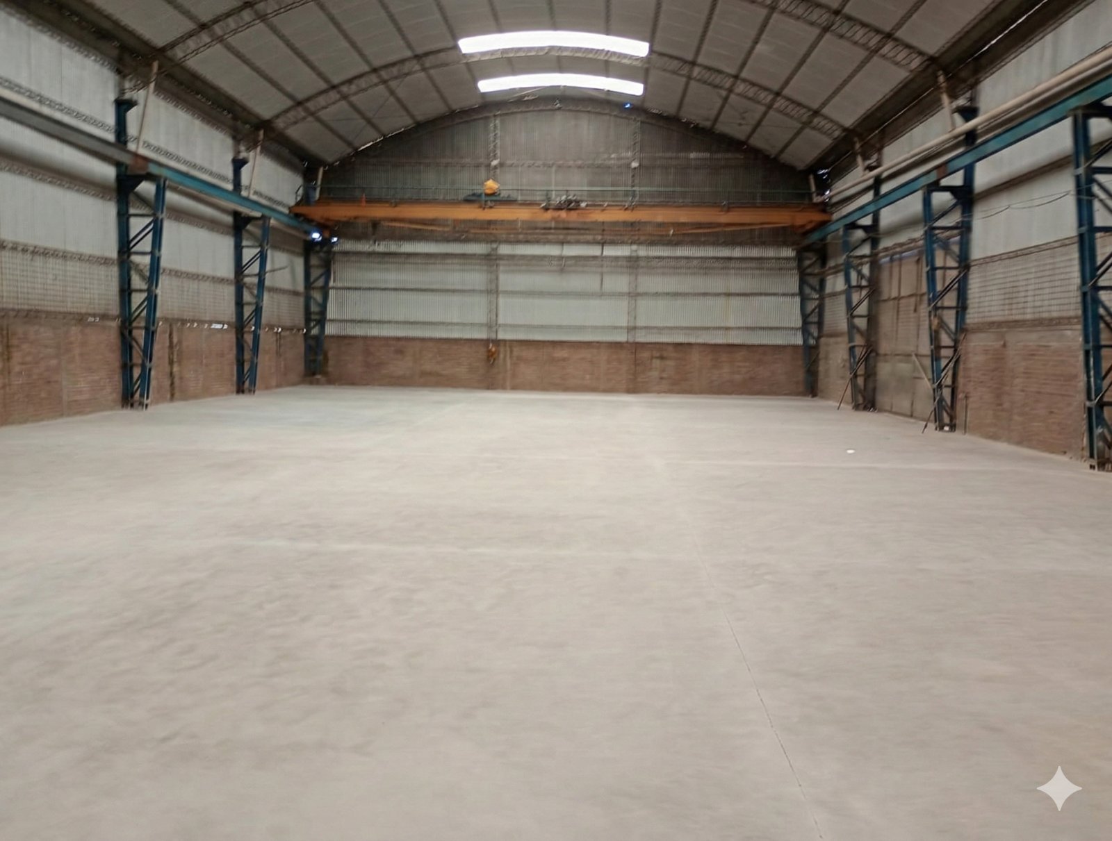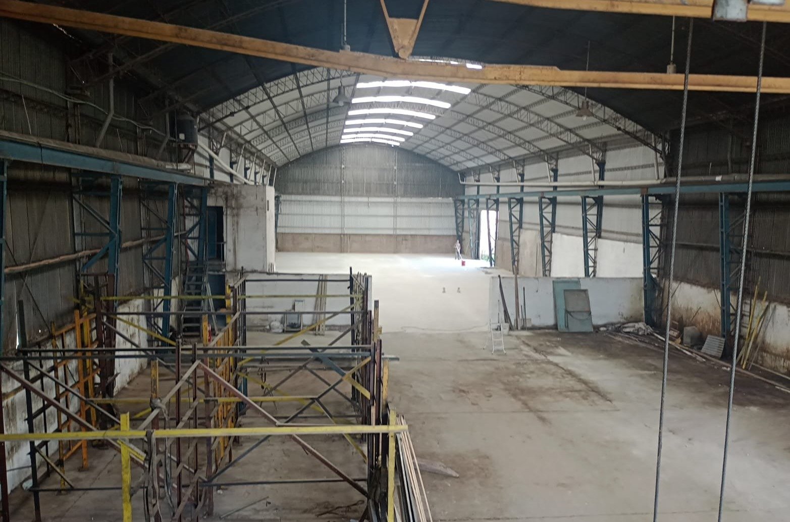 La nave tiene 1.100 m² libres, sin columnas, con techo parabólico y chapas translúcidas . Altura minima del techo 7,80 m en laterales y 10 m en cumbre.