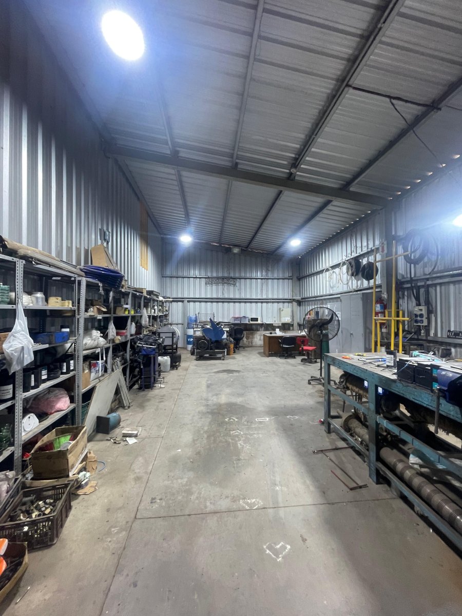 Iluminación: Natural lateral (chapas translúcidas) + luminarias industriales LED tipo galponeras suspendidas