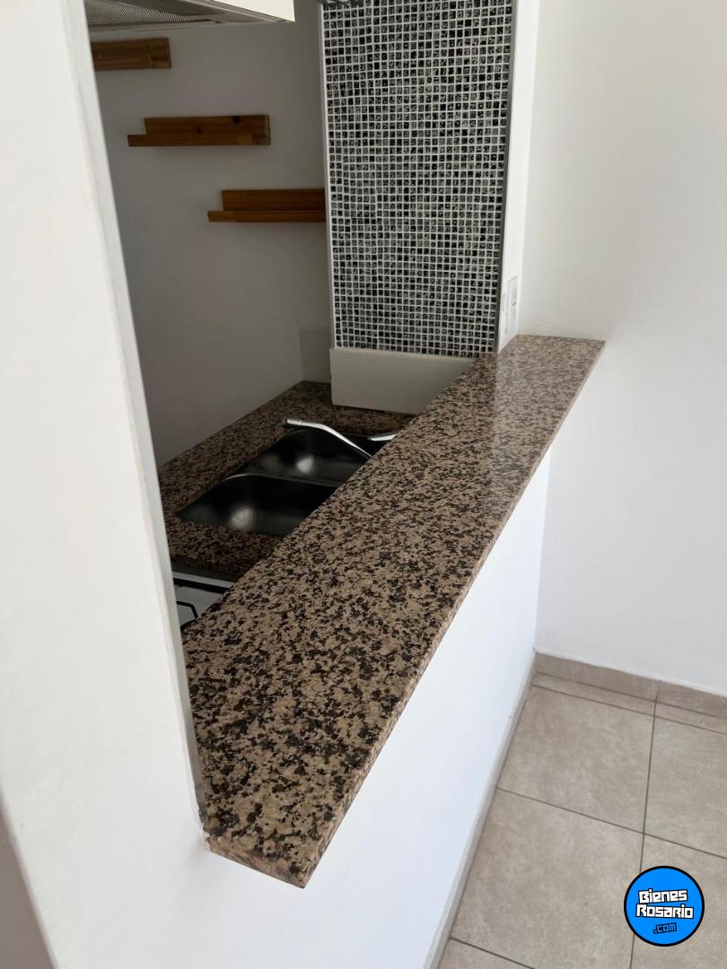 * Espacio multifuncional con cocina integrada al 醨ea social: piso cer醡ico, puerta Balc髇 con cortina black out. mesada doble bacha, grifer韆 mono comando, bajo mesada con 2 puertas, 3 cajones de melamina de color blanco. Cocina de 4 hornallas, con horno y extractor.